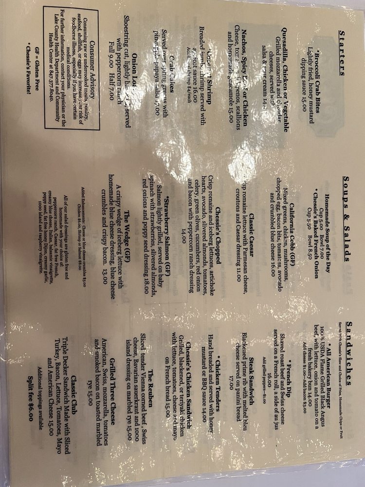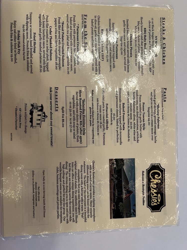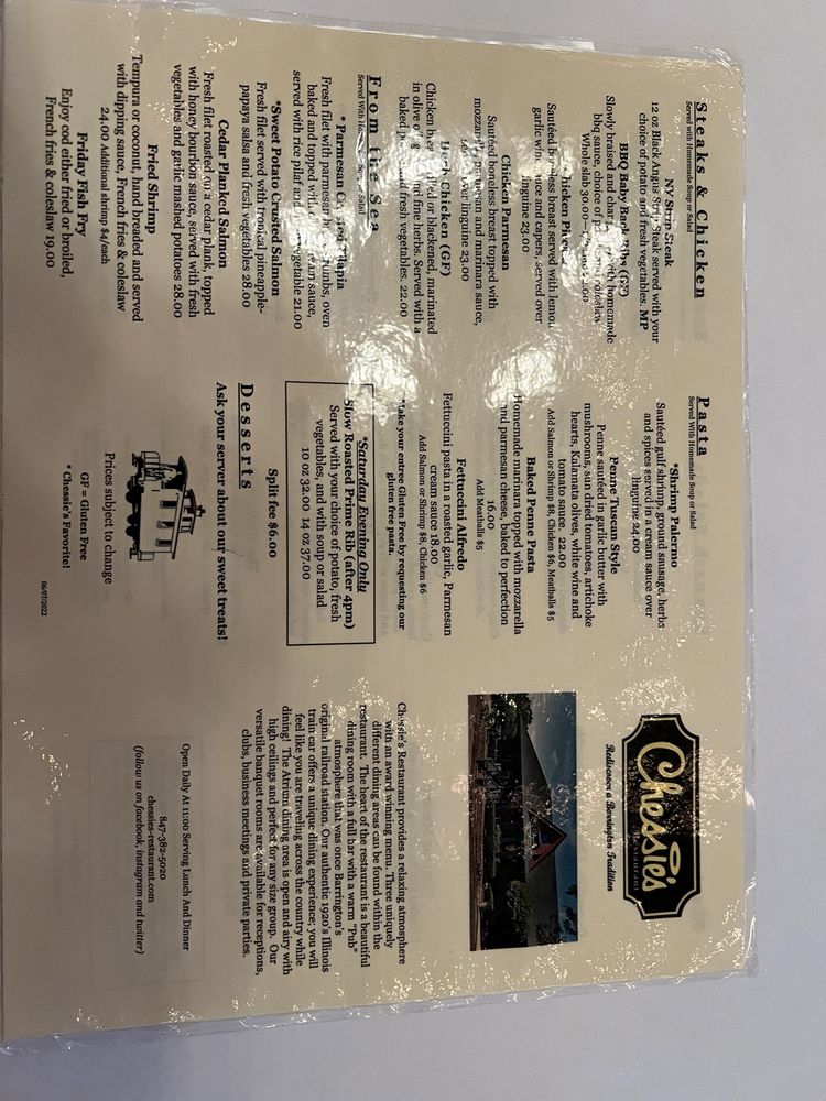 Chessie's Restaurant, located in Barrington, IL, offers a wide range of American cuisine with options for both meat-eaters and vegetarians. The menu features popular starters like Broccoli Crab Bites and Coconut Shrimp, as well as hearty salads and comforting soups. For main courses, you can indulge in BBQ Baby Back Ribs, Chicken Piccata, or Filet Mignon. The ambiance of dining in an old train car adds a unique touch to your dining experience. The restaurant also offers Happy Hour specials, full bar service, and free Wi-Fi. With positive reviews from satisfied customers praising the food quality and attentive service, Chessie's Restaurant is a hidden gem worth trying. Don't miss out on the chance to enjoy delicious food in a charming setting.